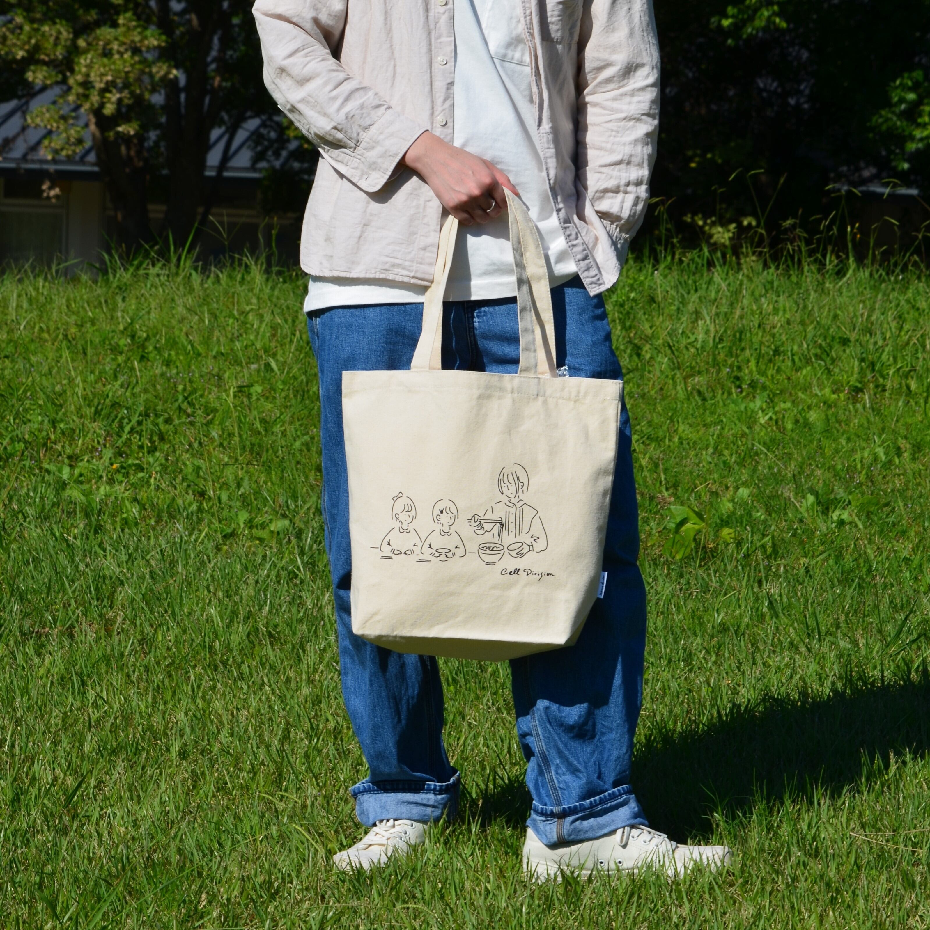 細胞分裂という科学現象を、母親(母細胞)が双子の娘(娘細胞)に食事を取り分ける様子に見立てたイラストに仕上げました。シンプルながらも抜け感があるイラストで、ちょっとしたお出かけのお供など、普段使いしやすいデザインになっています。